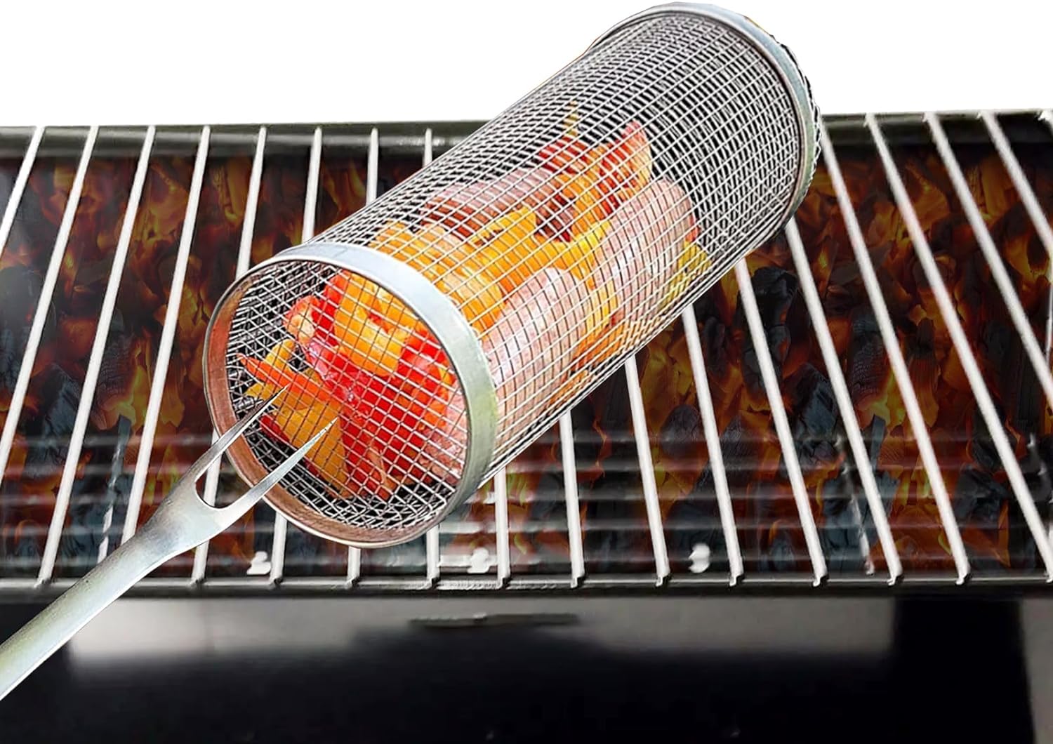 Versatile and Durable Stainless Steel Rolling Grill Basket for Fish, Meat, and Vegetables - Perfect for BBQ Lovers and Outdoor Cooking Enthusiasts