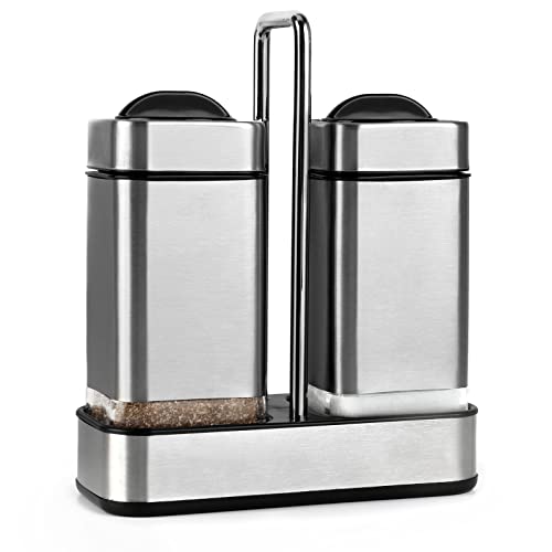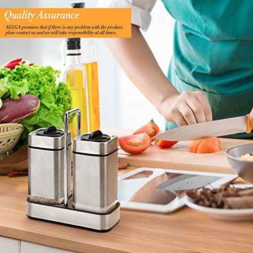 Salt and Pepper Shakers Set with Holder-Stainless Steel Salt Shaker with Adjustable Pour Holes-Set of 2 by Aelga