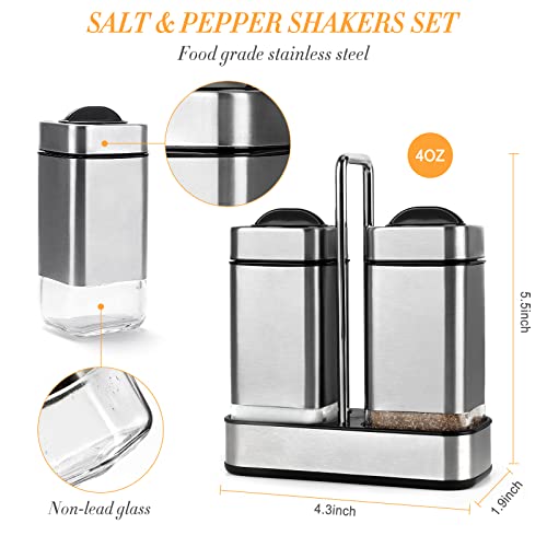 - TIMELESS ELEGANT DESIGN: These modern salt and pepper shakers with holders make a stylish addition to your kitchen, dining table, BBQ grill, camping, or restaurant table.