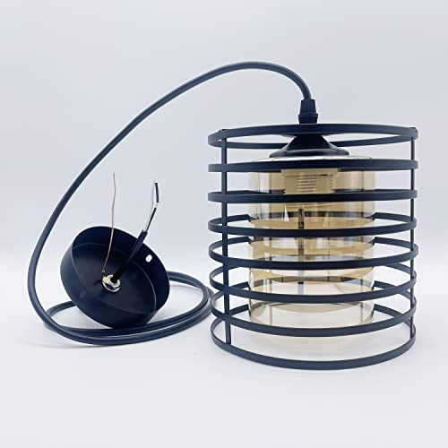 Scolii Industrial Pendant Light,Black Iron Cage,Adjustable Cable Hanging 4.9Ft,Amber Glass Shade ,Light Fixtures,E26 Socket φ6.3‘’×H6.3‘’(Bulbs Not Included)