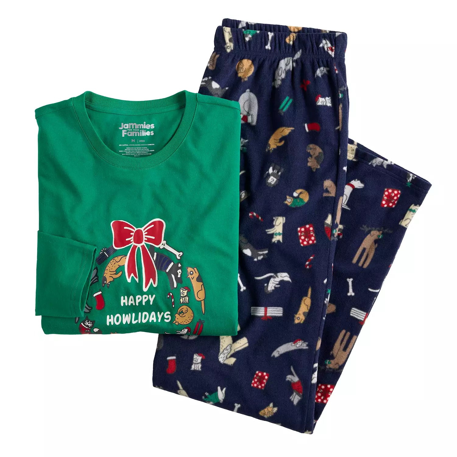 Celebrate the festive season with comfort and a dash of canine cheer with the Men's Jammies For Your Families Happy Howlidays Pajama Set. This delightful two-piece collection is designed to add a touch of whimsy to your holiday loungewear with its playful "Happy Howlidays" graphic on the crewneck top and a matching set of pants featuring an easy elastic waistband for a comfortable fit. The top is cut with long sleeves, perfect for cozy evenings spent by the fire or unwrapping gifts under the tree. The pants boast a generous 31-inch inseam (78.74 cm), ensuring a relaxed fit for a range of heights.