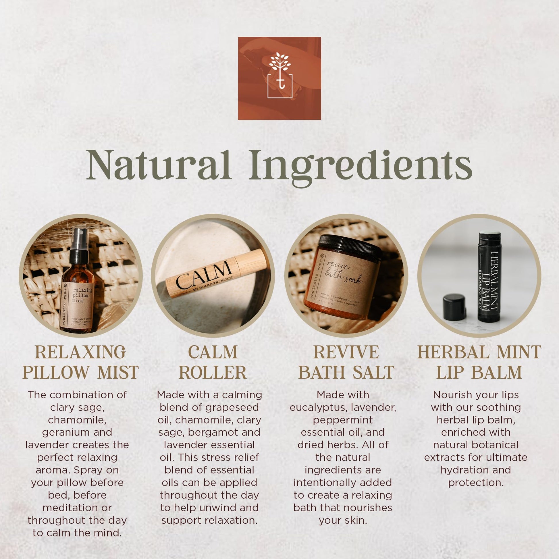 Spa Kit for Women Self Care Gift Set, Lavender Pillow Spray, Calm Essential Oil Roller 0.34 fl oz (10 ml), Mint Lip Balm & Epsom Salt Bath Soak