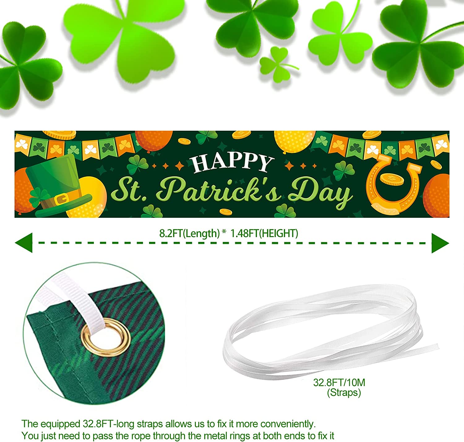 Package Included: 1 Banner (8.2 ft x 1.48 ft) and 1 32.8 ft hanging strap. It is big enough to be used as St. Patrick's Day party decorations, an outdoor welcome sign, and a photography background. The exquisite design is sure to catch everyone's attention.