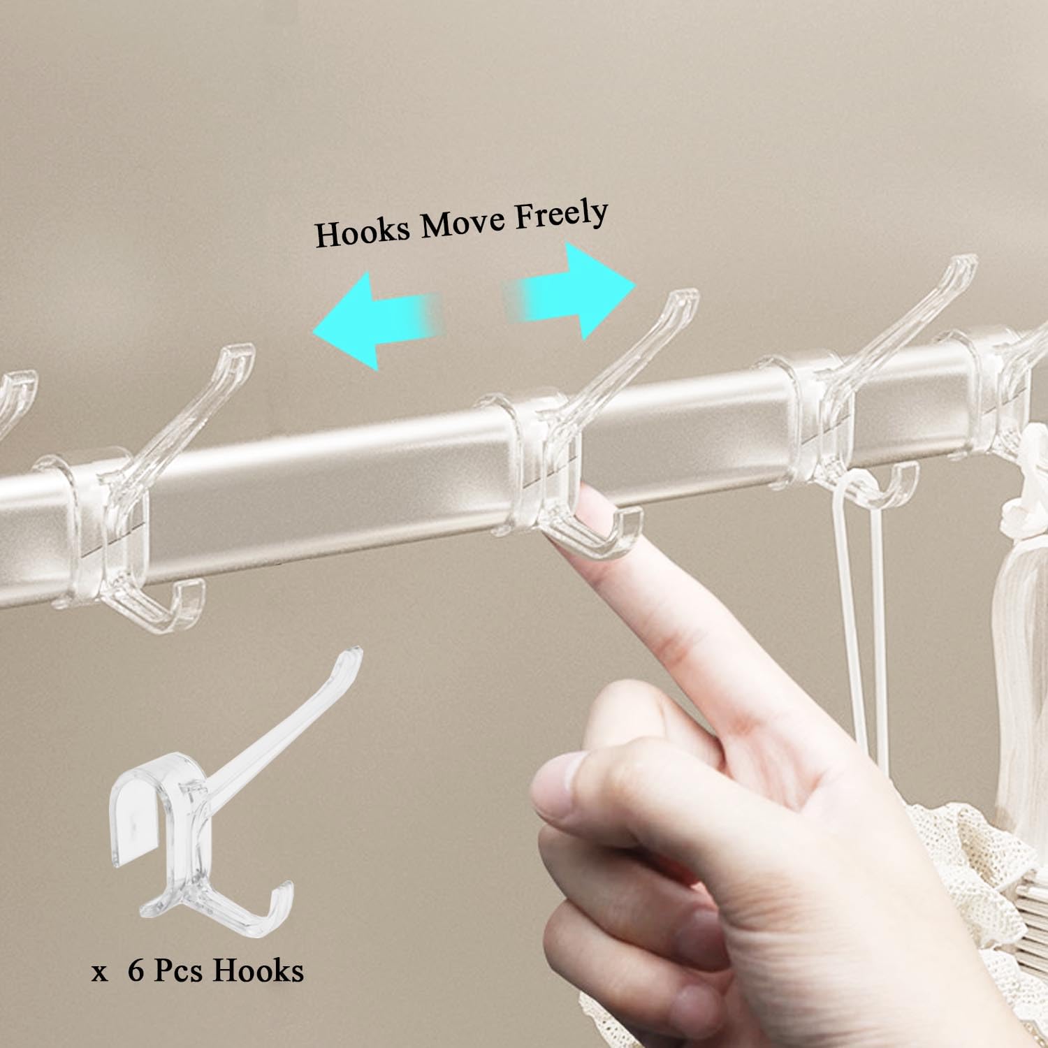 The design showcases a thick silver aluminum tube, harmoniously blended with clear durable plastic ends, emanating a modern charm. Need extra storage? Benefit from the five included transparent hooks, perfect for accommodating a variety of items, from brushes and bath balls to kitchen tools.