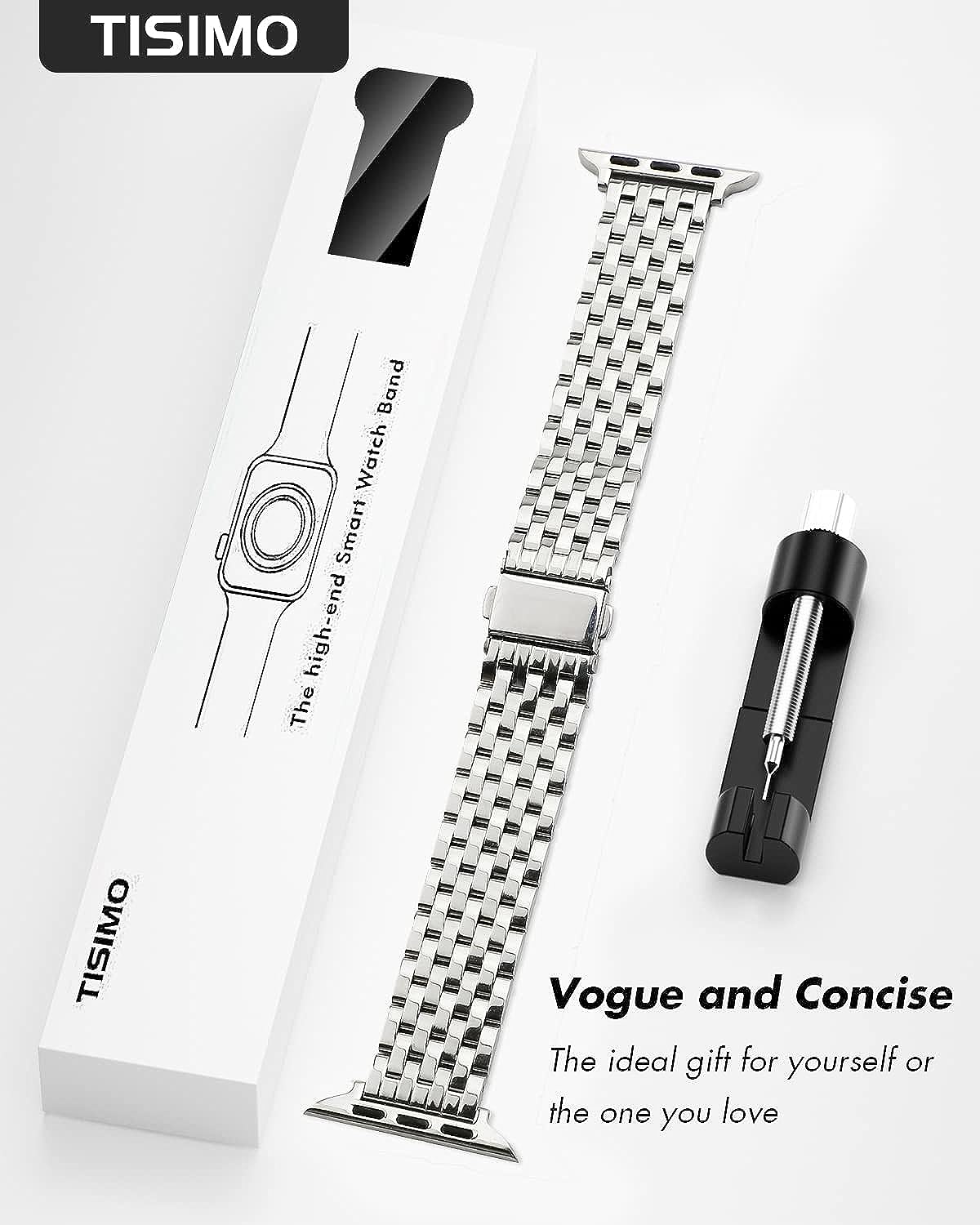 This sophisticated Apple Watch band makes a wonderful gift for any Apple fan. The package includes one handcrafted exquisite Apple Watch band for Apple Watch 42mm 44mm 45mm, a link remover set, an instruction manual, and a minimalist packaging box emphasizing the less is more ethos.