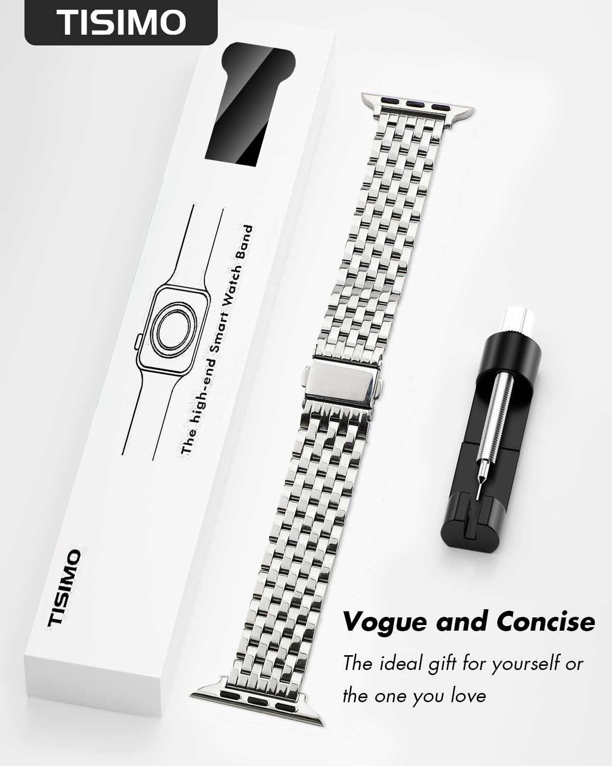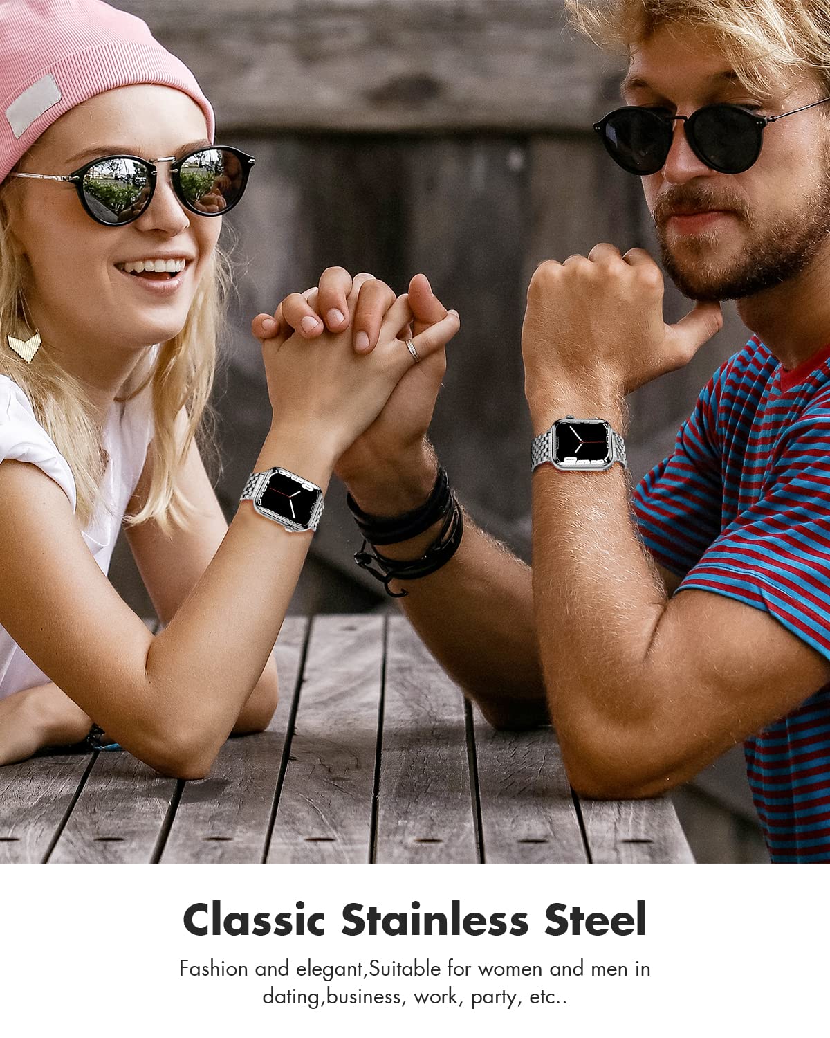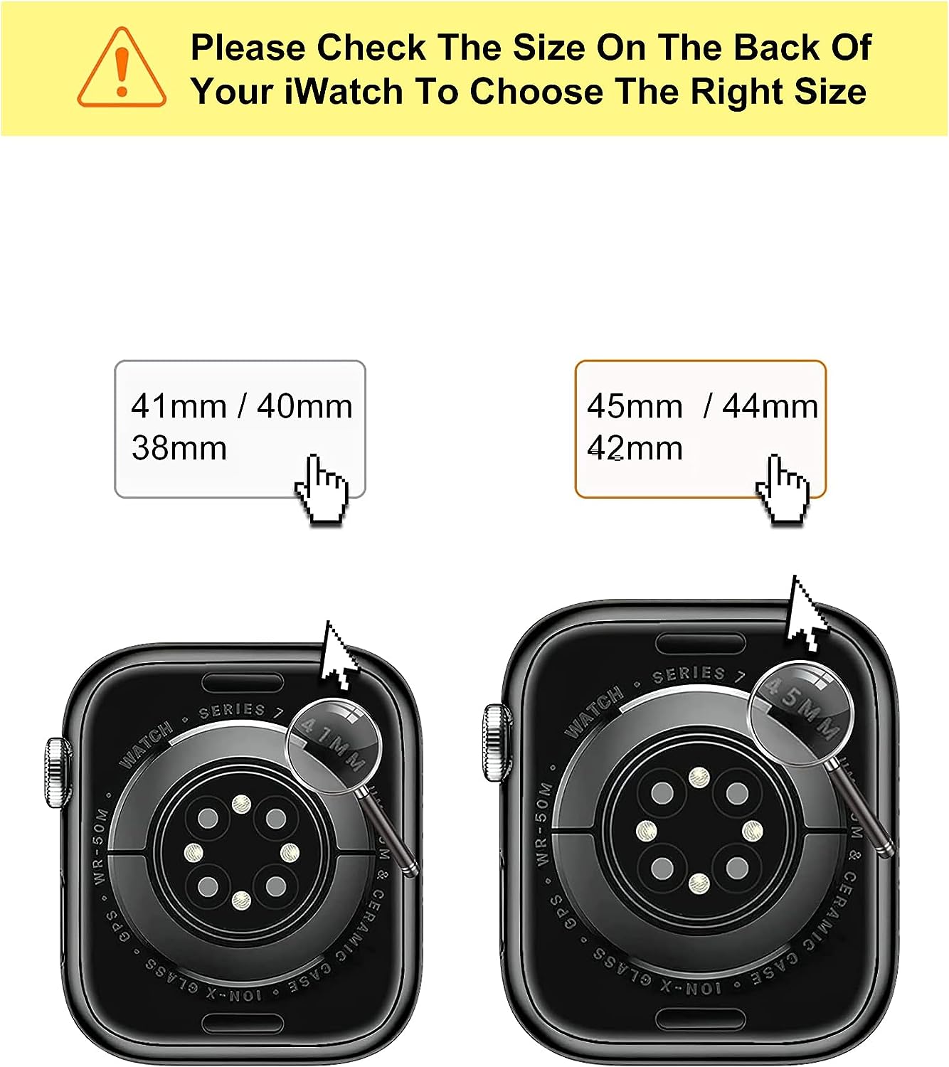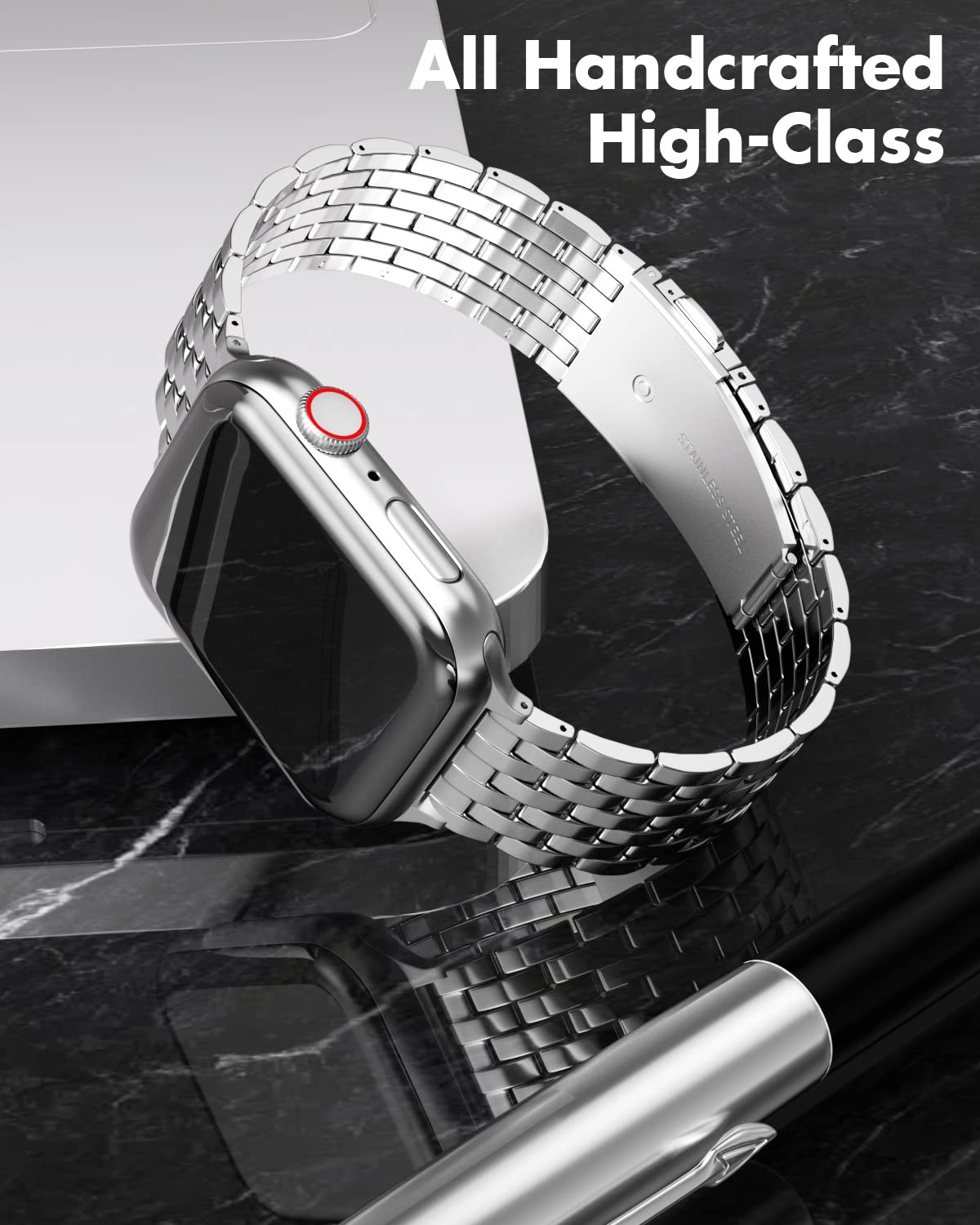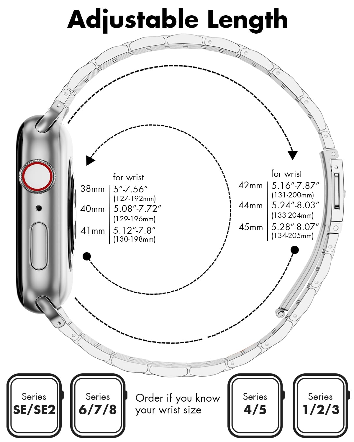 Embrace the timeless elegance and exquisite craftsmanship of this full series compatible stainless steel metal Apple Watch band, meticulously tailored to harmonize with Apple Watch 42mm 44mm 45mm, and Apple Watch Series 8/7/SE/SE2/6/5/4/3/2/1. The utmost attention has been paid to every detail to make this an outstanding replacement for Apple Watch bands. To choose the right size, kindly note the size on the back of your Apple Watch, as the watch case is not included.