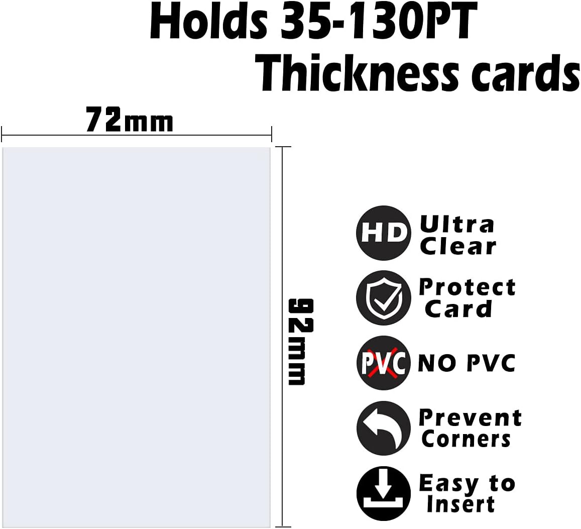 The sleeves are slightly larger than standard card sizes, accommodating cards up to 130PT in thickness. Whether you're a professional collector or a casual enthusiast, these sleeves offer robust protection against fading, water, and dust. Crafted from acid-free materials with no PVC, these sleeves are designed to provide superior preservation for both single and double-sided cards. Enhance your collecting experience with sleeves that offer both visibility and protection, keeping your valuable cards in mint condition for years to come.