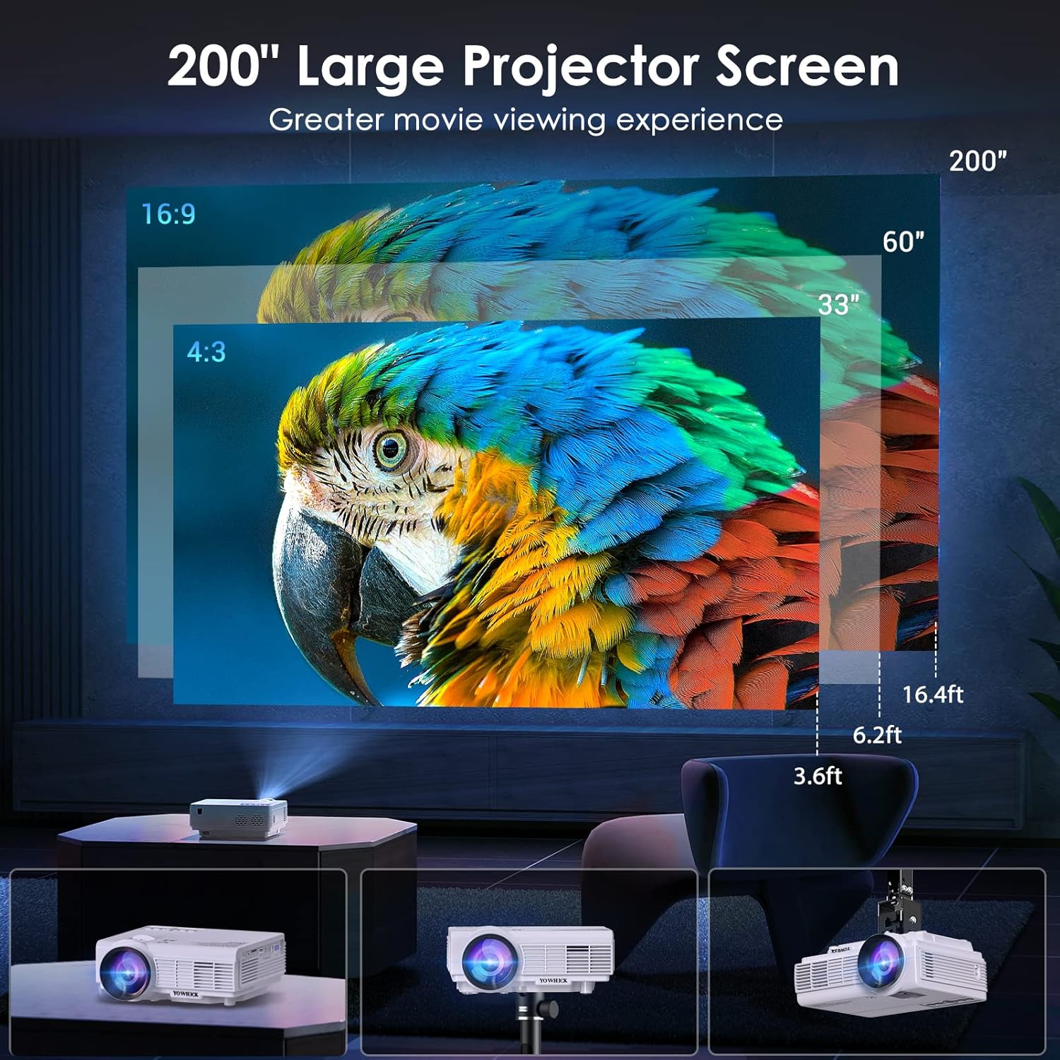 Designed for user-friendly operation, this model offers a zoom function to adjust image size without repositioning the projector, and an auto-shutdown feature for added convenience. Whether mounted on the ceiling, placed on a bracket, or simply set on a desktop, it fits seamlessly into any setup. Weighing just 2.2 pounds with a display size adjustable from 33 to 200 inches, it's perfect for home theaters, outdoor viewings, parties, or even while camping. Certified by FCC, CE, and RoHS, this projector promises quality and reliability for all your entertainment needs.