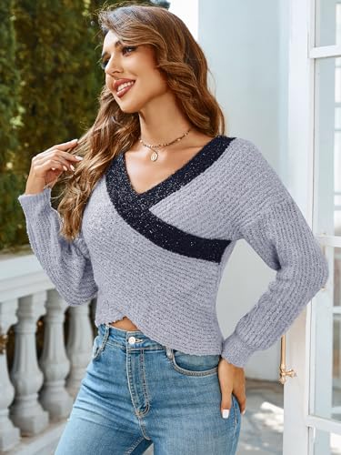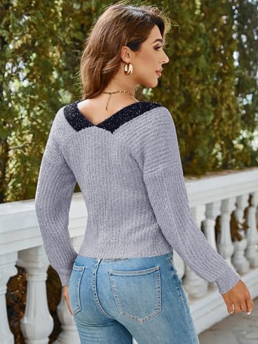 Stylish Purple Sparkle V-Neck Cropped Sweater for Trendy Fall & Winter Fashion