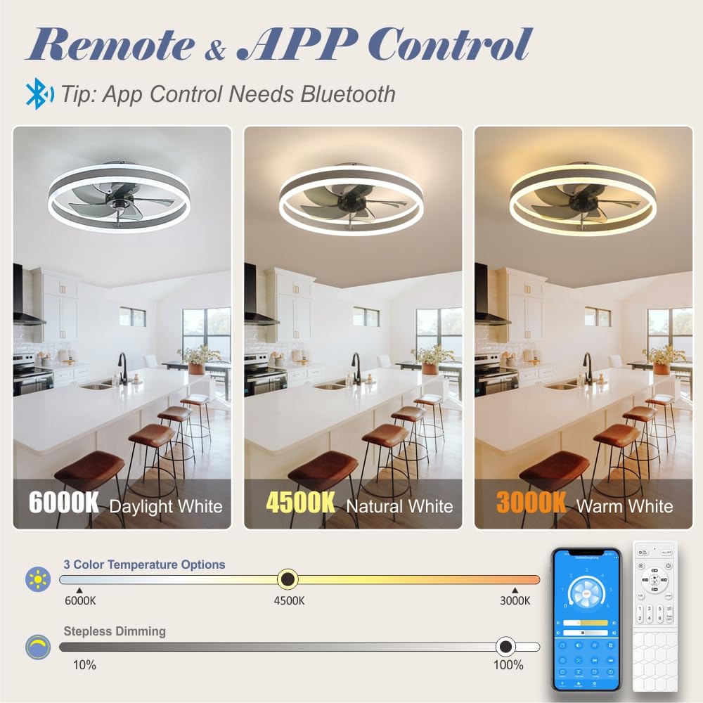Ceiling Fan with Lights and Remote, 19.7 x 19.7 x 5.9 in (50 x 50 x 15 cm), Dimmable LED, 3 Color Temps, 6 Speeds, Reversible, Flush Mount