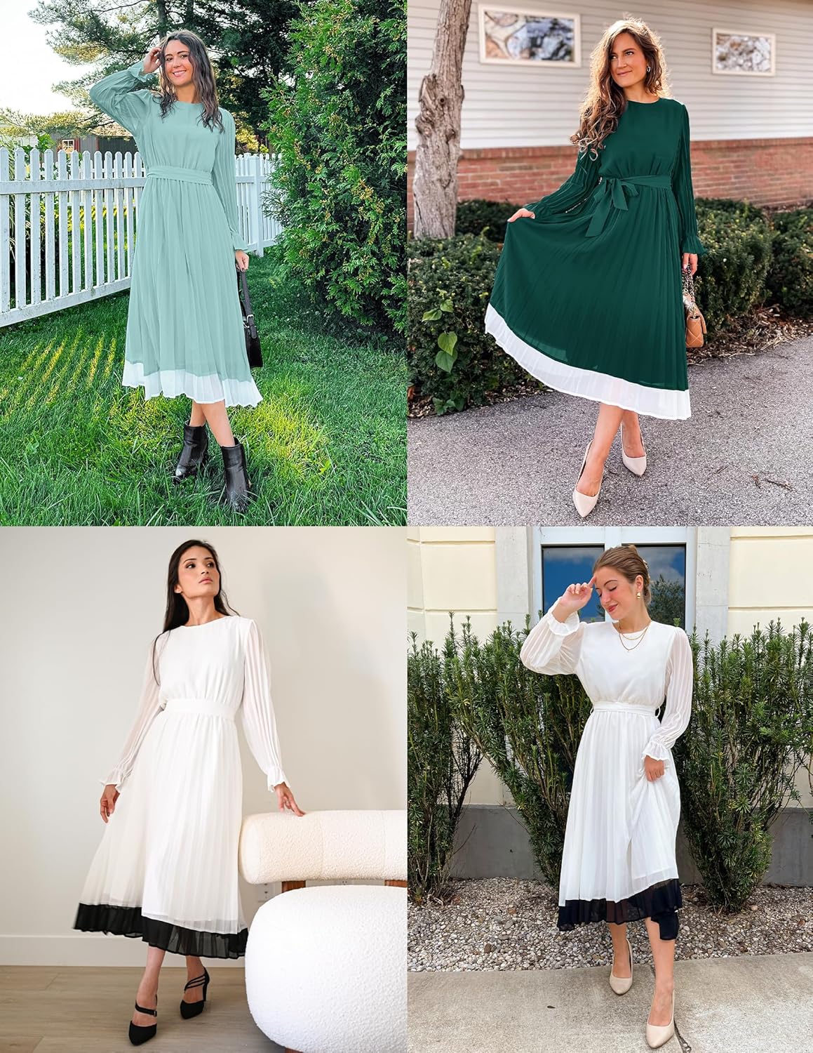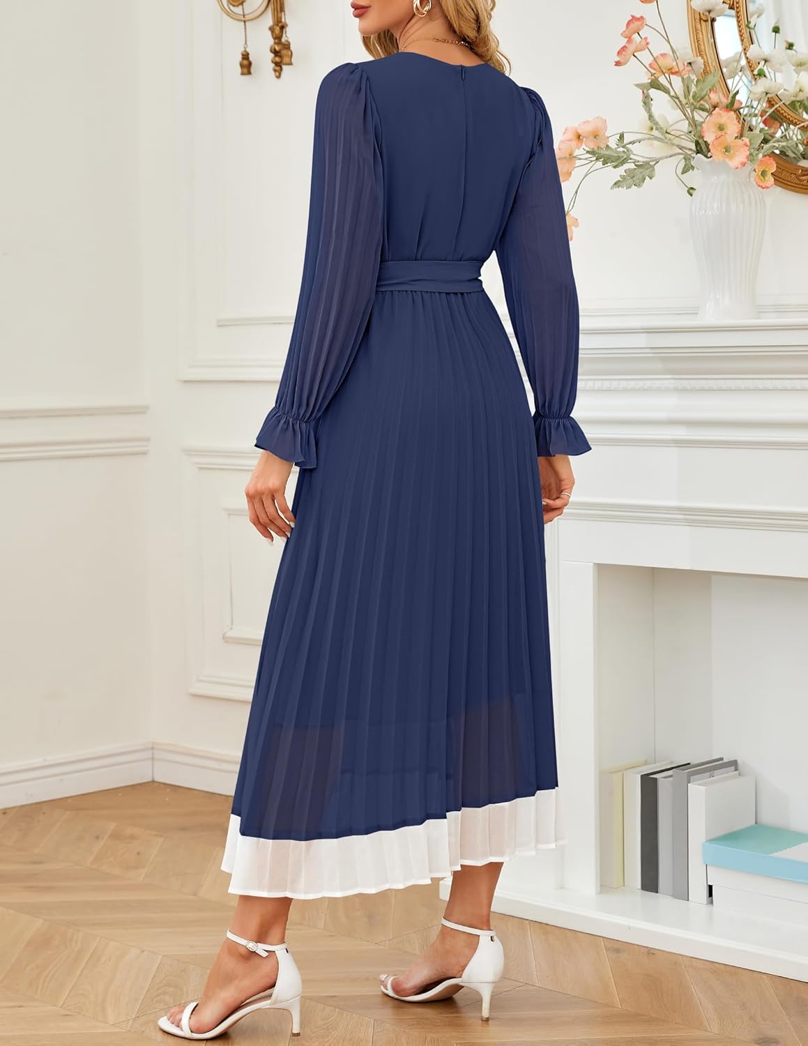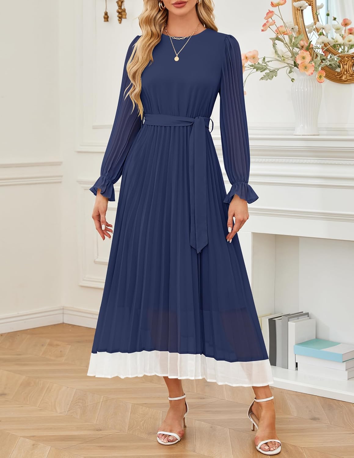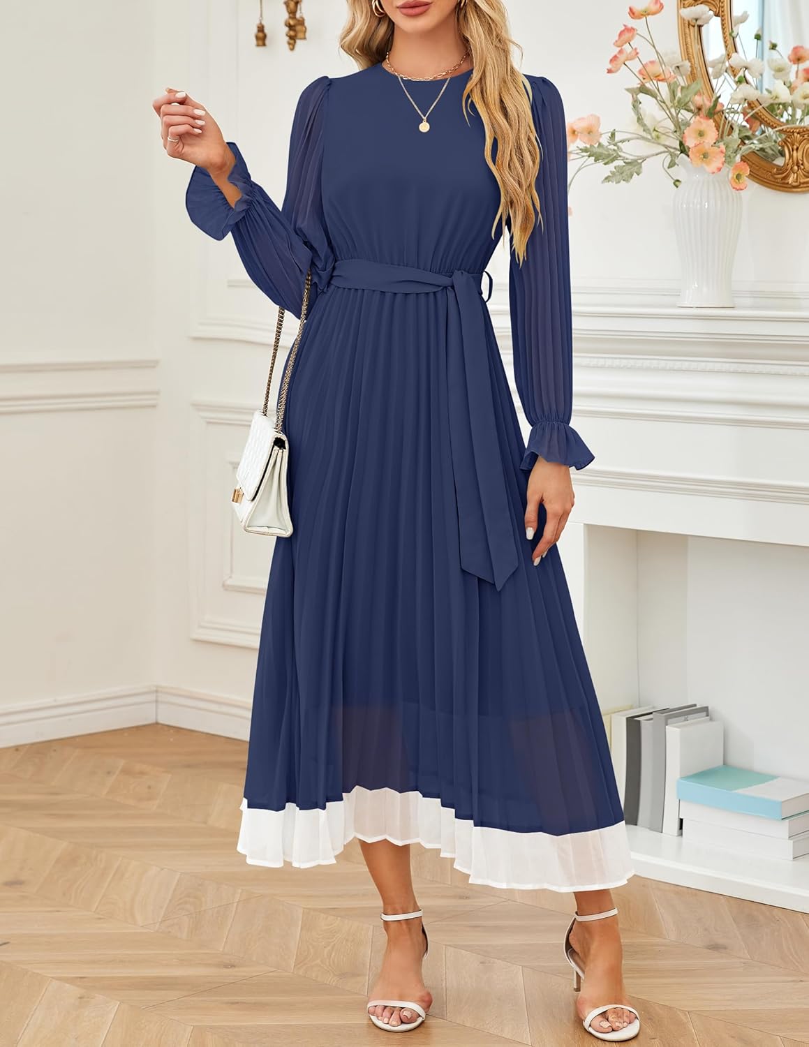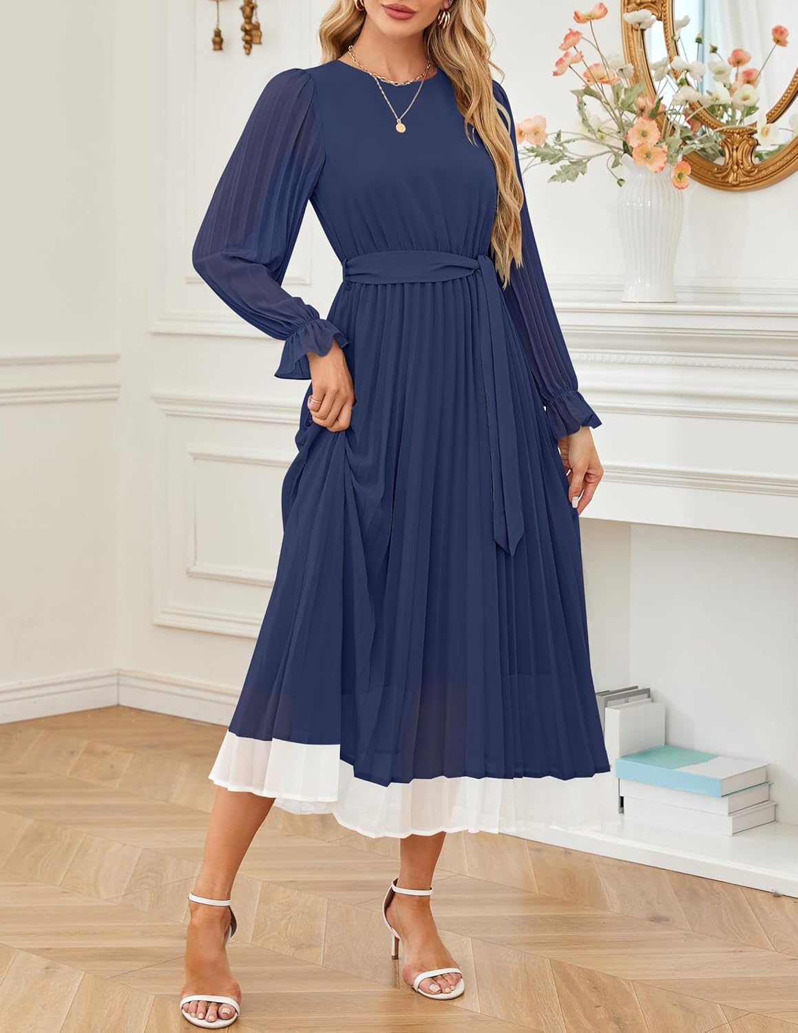 Dark Blue Medium Women's Long Sleeve Chiffon Midi Dress with Pleated Skirt and Detachable Belt