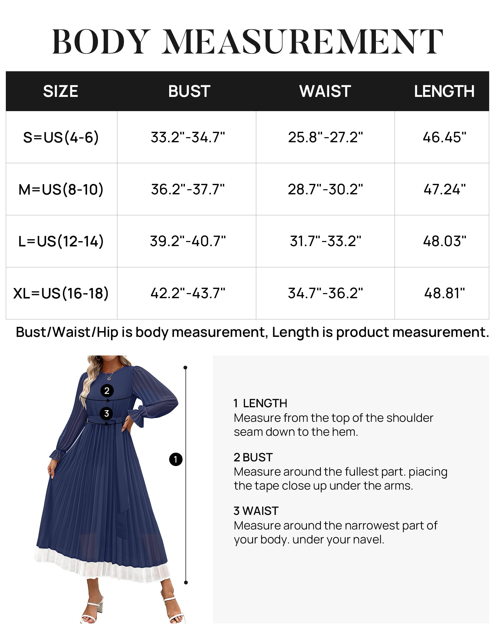 Embrace the essence of autumn elegance with our Dark Blue Women's Chiffon Midi Dress. Designed to fit size Medium (US 8-10), this dress ensures a flattering fit with its non-stretchy fabric—be sure to check the size chart for the best fit. The long sleeves, accentuated with ruffled elastic cuffs, complement the classic crew neck, while the pleated skirt introduces a refined dynamism to your movement. A detachable belt cinches the waist, enhancing the flowy A-line silhouette that gracefully transitions from a casual daytime look to an enchanting evening ensemble. The invisible back zipper maintains a seamless look, and the contrast color hem adds a playful touch to the overall sophistication.